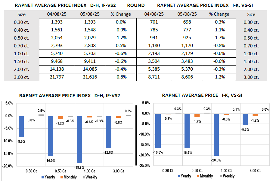 W tygodniu kończącym się 8 maja dalej na rynku diamentów królowała stabilność, z ograniczonym handlem ze względu na atmosferę wyczekiwania na ruchy Amerykanów. Informują oni o rozmowach z Chinami, ogłosili trade deal z Wielką Brytanią, a także próbują porozumieć się z Indiami. To budzi lekki optymizm na rynku. Ceny diamentów małych pozostają na wysokich poziomach. Indeks RAPI dla diamentów 0,3-karatowych w kolorach D-H i czystości IF-VS2 wzrósł o 0,6%. Wzrost zanotował jeszcze indeks RAPI dla diamentów 3-karatowych (+0,3%), z kolei indeksy dla diamentów 0,5- i 1-karatowych spadły o 0,3%. Wśród diamentów o gorszych parametrach koloru i jakości zmiany były już minimalne, ale jednak na plus.