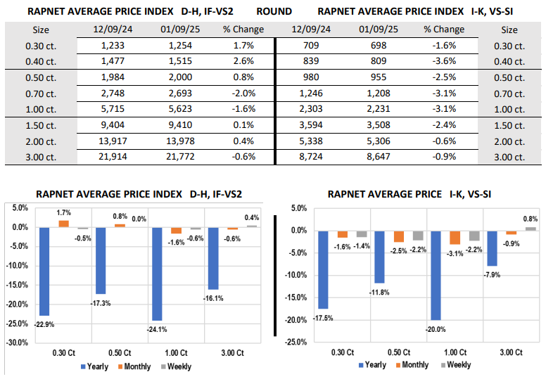 W drugim tygodniu stycznia rynek diamentów nieco się skorygował, przy czym widać wyraźną dysproporcję zmian cen między diamentami o wysokich parametrach koloru i czystości a tymi o niższych parametrach. Wśród diamentów w kolorach I-K i czystości VS-SI dominowały spadki od 1,4% (diamenty 0,3-karatowe) do 2,2% (diamenty 0,5 i 1-karatowe). Jedynie ceny diamentów 3-karatowych zyskały 0,8%. Z kolei wśród diamentów o wysokich parametrach (kolor D-H, czystość IF-VS2) spadki były niewielkie, rzędu 0,5%, a indeks RAPI dla diamentów 3-karatowych zyskał 0,4%.