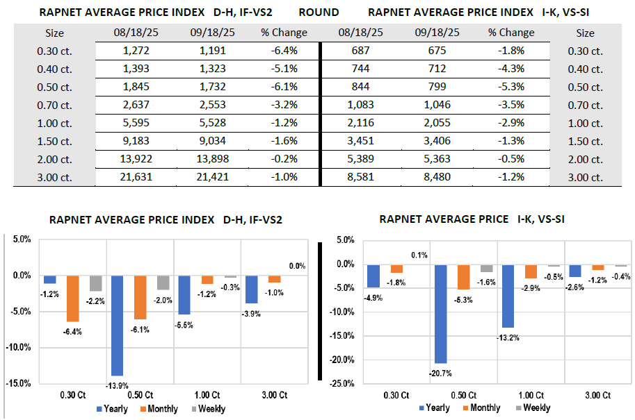 W tygodniu kończącym się 18 września na rynku diamentów ponownie przeważały spadki cen i ponownie ogniskowały się one na mniejszych kamieniach. Tym razem największej przecenie, ok. 2%, uległy indeksy RAPI dla diamentów 0,3- oraz 0,5-karatowych w kolorach D-H i czystości IF-VS2. Większe diamenty o wysokich parametrach koloru i czystości spadały minimalnie. W przypadku indeksów RAPI dla diamentów o niższych parametrach koloru i czystości największy spadek zanotował indeks RAPI dla kamieni 0,5-karatowych, zniżkując o 1,6%. Z kolei indeks RAPI dla diamentów 0,3-karatowych zanotował minimalny wzrost, o 0,1%.